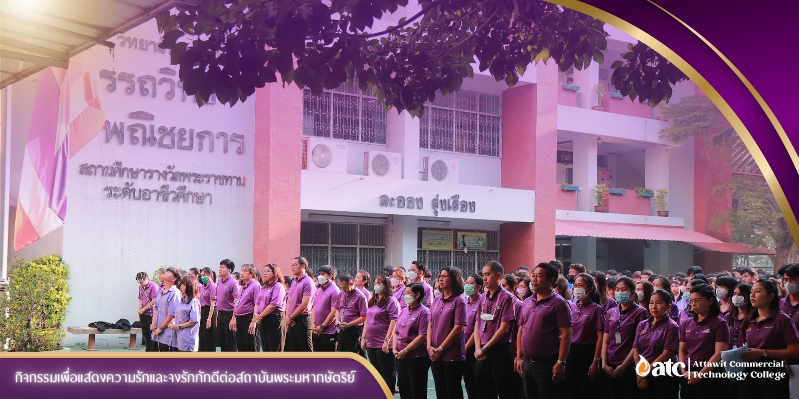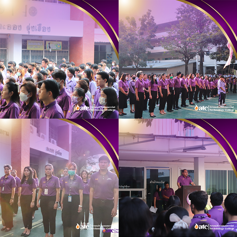 14 กุมภาพันธ์ 2567 ดร.สมศักดิ์ รุ่งเรือง ผู้อำนวยการวิทยาลัยฯ ผู้บริหาร คณาจารย์ บุคลากรทางการศึกษาและ นักศึกษา จัดกิจกรรมฯ เพื่อแสดงความรัก และความจงรักภักดีต่อสถาบันพระมหากษัตริย์และสมเด็จพระกนิษฐาธิราชเจ้า กรมสมเด็จพระเทพรัตนราชสุดาสยามบรมราชกุมารีทั้งนี้ ผู้บริหาร อาจารย์ และบุคลากรทางการศึกษา ต่างพร้อมใจกัน แต่งกายด้วยเสื้อสีม่วงแสดงให้เห็นถึงความรักและสามัคคี ซึ่งเป็นสัญลักษณ์ถึงความจงรักภักดีต่อสถาบันพระมหากษัตริย์ และสมเด็จพระกนิษฐาธิราชเจ้า กรมสมเด็จพระเทพรัตนราชสุดาสยามบรมราชกุมารี ณ วิทยาลัยเทคโนโลยีอรรถวิทย์พณิชยการ